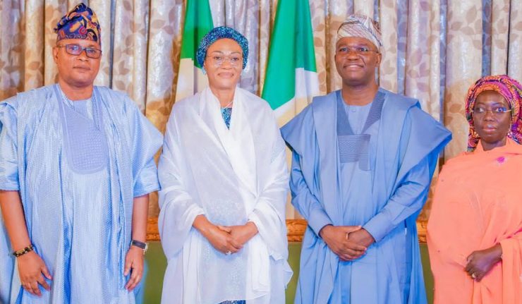 From left: Senator representing Lagos Central and Chairman Senate Committee on Marine Transport, Senator Wasiu Eshinlokun Sanni, The First Lady of the Federal Republic of Nigeria Senator Oluremi Tinubu, CON, Senator representing Lagos East and Chairman Senate Committee on Banking and Finance, Senator Adetokunbo Abiru and Senator representing Lagos West and Chairman Senate Committee on Social Welfare and Poverty Alleviation Senator Oluranti Adebule when they paid a courtesy visit to the First Lady at her office at the State House, Abuja on Thursday.