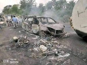 ELEVEN persons and 10 vehicles were burnt to ashes in the auto crash resulting from petrol tanker fire explosion.