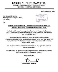 According to him, a letter on his letterhead, signed by a forger titled “Resignation from the All Progressives Congress, APC, Withdrawal from Yobe North Senatorial Race” and addressed to the party National Chairman, Abdullahi Adamu, implied that he had left the party and withdrawn his candidature and thereby giving the party the power to replace him. The letter written on his letterhead was stamped received by the office of the Chairman. Curiously the letter that was dated September 4, 2022 while the official stamp of the party secretariat carried a July, 2022 date make a mockery of the intention of the writer.