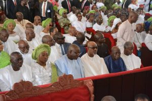 L-R: Lagos State governor, Babajide Sanwo-Olu; wife of the former governor of Ekiti State, Erelu Bisi Fayemi; her husband, Kayode Fayemi; Ogun State governor, Dapo Abiodun, presidential candidate of the All Progressives Congress, Bola Tinubu and Vice President, Yemi Osinbajo at the burial service of Lady Evangelist Grace Akeredolu, mother of Ondo State Governor, Rotimi Akeredolu at St. Andrews Anglican Church, Owo on Saturday