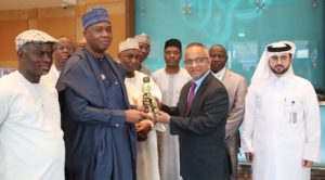 President of the Senate, Dr. Abubakar Bukola Saraki receiving a souvenir from the Acting Director for Global Brand Management of Aljazeera, Mohammed Ihtisham Hibatullah, during a tour of the Television Network by members of the National Assembly delegation to the 140th General Assembly of the Inter-Parliamentary Union (IPU), in Doha, Qatar.